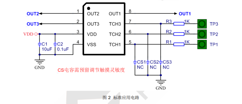 若其它條件固定不變,根據(jù)各鍵的實際情況調(diào)節(jié) Cs 電容值使其達(dá)到最佳靈敏度,同時也使各鍵靈敏度達(dá)到一致。當(dāng) Cs 電容不接時靈敏度最高,Cs1~Cs3 的容值越大靈敏度越低,Cs 可調(diào)節(jié)范圍為:1~20pF 一般取值 5 pF(觸摸盤 10*10mm 介質(zhì)厚度 3mm)