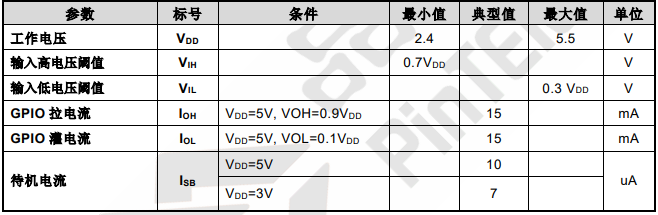 表 3 直流特性(如無特殊說明 VDD = 2.4V~5.5V,Temp = 25ºC)