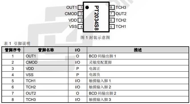 產(chǎn)片介紹:PT2034 是一款電容式觸摸控制 ASIC,支持 3 通道觸摸輸入,2 線 BCD 碼輸出。具有低功耗、高抗干擾、寬工作電壓范圍的突出優(yōu)勢。