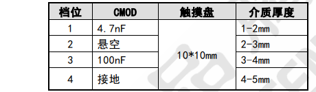 3) 所有通道觸摸靈敏度粗調(diào)可由 CMOD 引腳決定,一共分為 4 檔