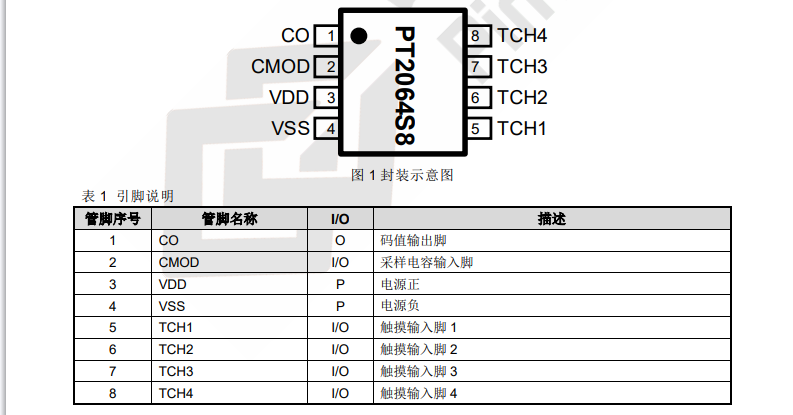 PT2064 是一款電容式觸摸控制 ASIC,支持 4 通道觸摸輸入,1 線碼值輸出。具有低功耗、高抗干擾、寬工作電壓范圍的突出優(yōu)勢。