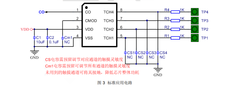 4) 單通道觸摸靈敏度細調(diào)可改變 Cs1~Cs4(見圖 3)容值的大小實現(xiàn)若其它條件固定不變,根