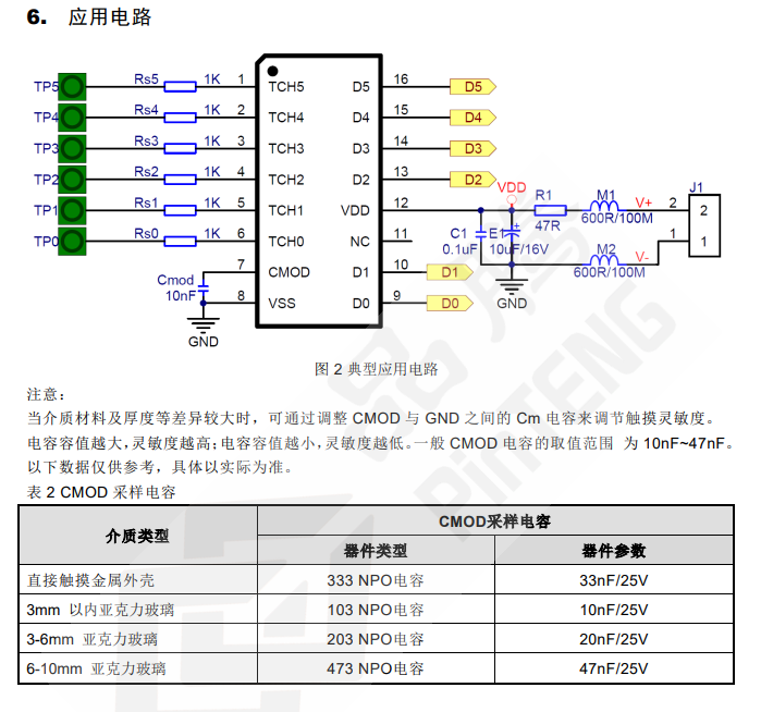 ● CMOD 腳外接電容可調(diào)節(jié)靈敏度,電容越大靈敏度越高