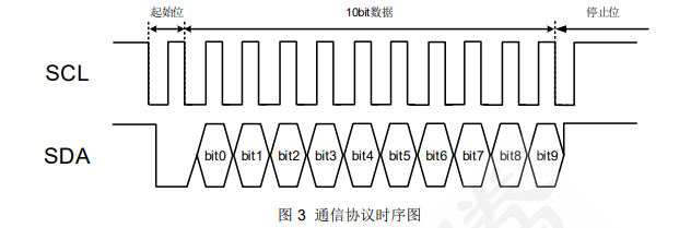 主控 MCU 讀取了 10bit 的數(shù)據(jù)后,M_SCL 發(fā)送一個時鐘,M_SDA 檢測到高電平,則通訊結(jié)束。