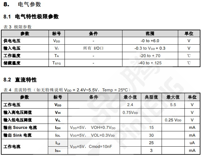 ● 工作電流:3mA(正常模式);25uA(低功耗模式)@VDD=5V&CMOD=10nF