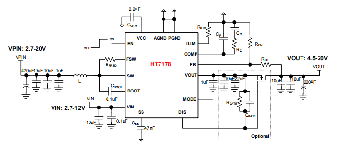 HT7178具有2.7V至20V寬輸入電壓范圍,可為采用單節(jié)或兩節(jié)鯉電池,或12V鉛酸電池的應(yīng)用提供支持。該器件具備14A開關(guān)電流能力,并且能夠提供高達(dá)20V的輸出電壓。