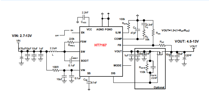 HT7167具有2.7V至13V寬輸入電壓范圍,可為采用單節(jié)或兩節(jié)鯉電池的應用提供支持。該器件具備12A開關電流能力,并且能夠提供13V的輸出電壓。