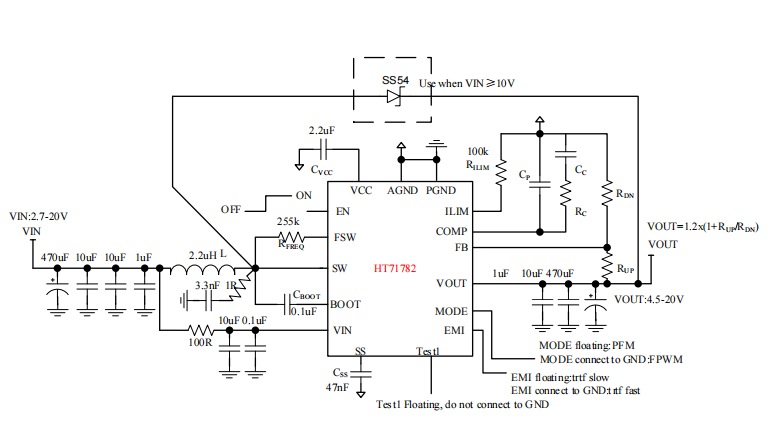 HT71782具有2.7V至20V寬輸入電壓范圍, 可為采用單節(jié)或兩節(jié)鋰電池的應(yīng)用提供支持。 該器件具備15A開關(guān)電流能力,并且能夠提供 20V的輸出電壓。