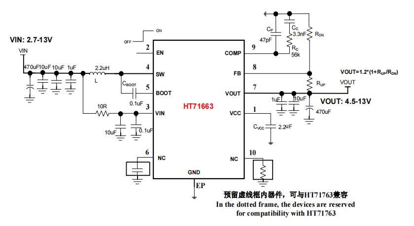 HT71663具有2.7V至13V寬輸入電壓范圍,可為采用單節(jié)或兩節(jié)鋰電池的應(yīng)用提供支持。該器件具備10A開關(guān)電流能力,并且能夠提供最高13V的輸出電壓。