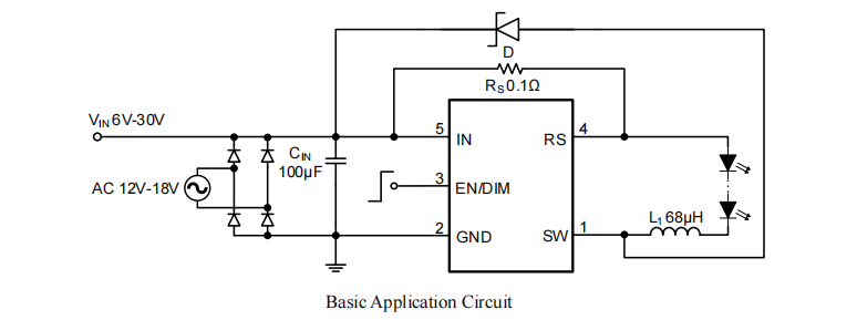 從 6V 至 30V 的寬輸入電壓驅(qū)動(dòng)高亮度 LED。 RY7312 采用遲滯控制