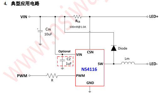NS4116 內(nèi)置功率開關(guān)管和一個高壓電流檢測模塊,可以使用外部電阻設(shè)置 LED 平均電流。可以通過 PWM 引腳實現(xiàn)開/關(guān)使能、模擬和 PWM 調(diào)光功能。