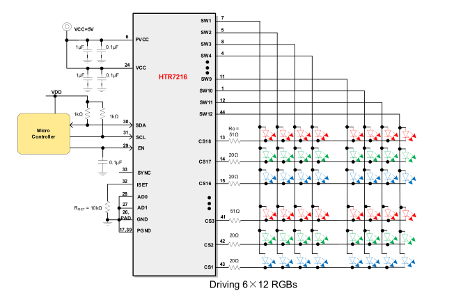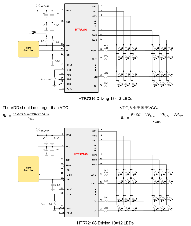 產(chǎn)片介紹:HTR7216(S)是一款通過1MHz的I2C接口(HTR7216)或10MHz SPI接口(HTR7216S)進行編程的支持18×12陣列的LED驅(qū)動芯片,每路SWx都支持8位PWM數(shù)據(jù)進行獨立調(diào)光,并且每路CSx都有8位的直流掃描數(shù)據(jù)用來支持每個點的256階的線性PWM調(diào)光,并且每個CSx都支持256階的直流電流可調(diào)節(jié)等級。