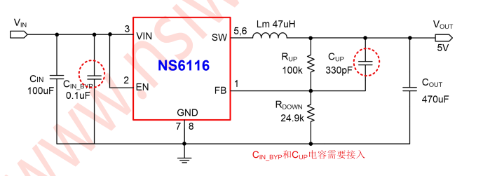 NS6116 內(nèi)置線電壓補(bǔ)償,可通過(guò)調(diào)節(jié) FB 端口的分壓電阻阻值來(lái)實(shí)現(xiàn)。NS6116 不僅可實(shí)現(xiàn)單芯片降壓電源管理方案,還可以與 QC2.0/ QC3.0 識(shí)別芯片構(gòu)成快速充電電源管理方案。另外,芯片包含多重保護(hù)功能:過(guò)溫保護(hù),輸出短路保護(hù)和輸入欠壓保護(hù)等。