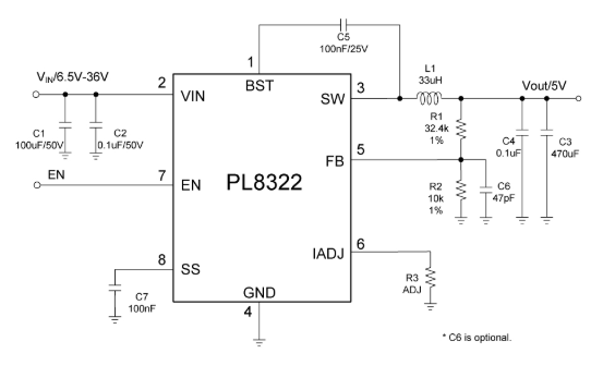 PL8322集成了高效率的同步降壓開關(guān)功率管,其中包括高側(cè)36V、76mΩ和低側(cè)36V、52mΩ MOSFET,以提供3.1A的連續(xù)負(fù)載電流,工作輸入電壓范圍為6.5V至30V,并具有33V的輸入過(guò)壓保護(hù)。峰值電流模式控制提供快速的瞬態(tài)響應(yīng)和逐周期電流限制。