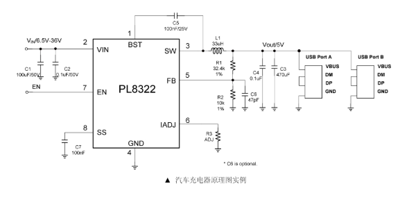 PL8322具有可配置的線路壓降補(bǔ)償和可配置的充電電流限制。CC/CV模式控制在恒流充電和恒壓充電階段之間提供平滑的過(guò)渡。內(nèi)置軟啟動(dòng)防止在升壓時(shí)的涌入電流。
