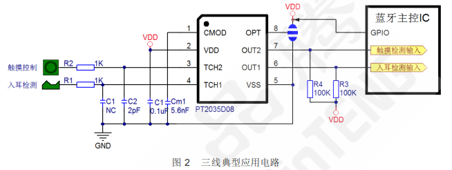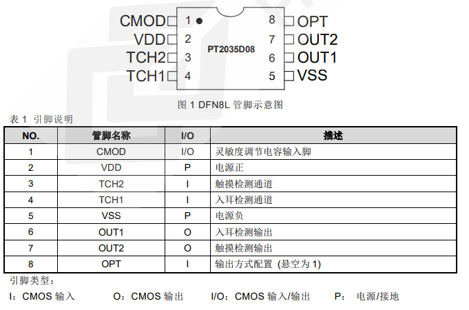 PT2035 是一款支持入耳檢測(cè)的藍(lán)牙耳機(jī)專用觸摸芯片,該芯片具有寬工作電壓、低功耗、高抗干擾能力的特性。