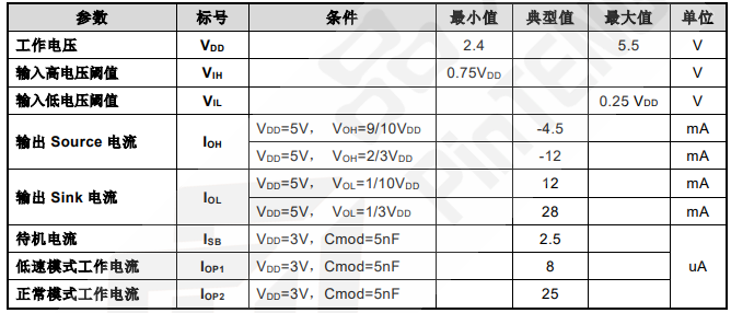 ● 待機(jī)電流約 2.5uA@VDD=3V/CMOD=5nF