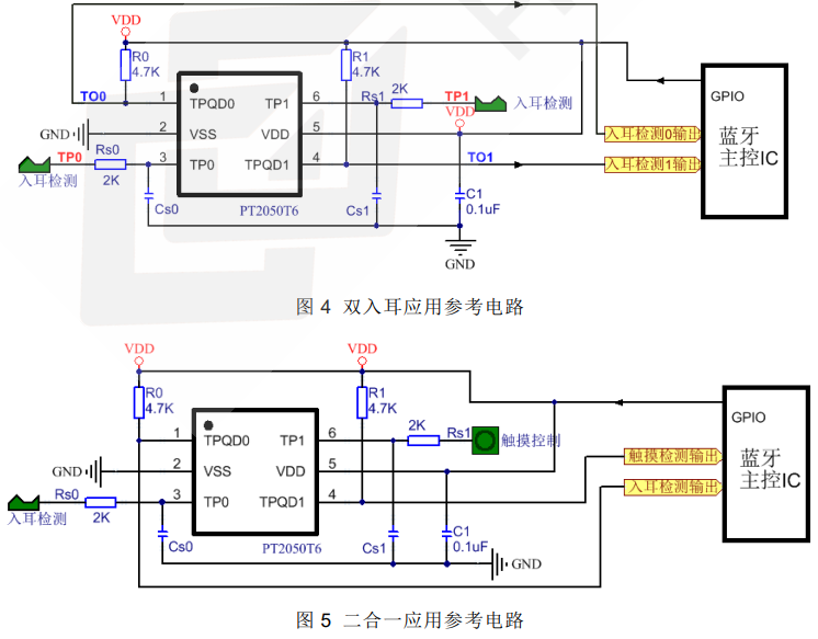 PT2050 是一款應(yīng)用于雙入耳檢測或單入耳檢測的 TWS 藍(lán)牙耳機(jī)二合一觸摸檢測芯片。該芯片內(nèi)建穩(wěn)壓電路,提供穩(wěn)定電壓給觸摸感應(yīng)電路使用,同時內(nèi)部集成高效完善的觸摸檢測算法,使得芯片具有穩(wěn)定的觸摸檢測效果,具有寬工作電壓與低功耗的特性。