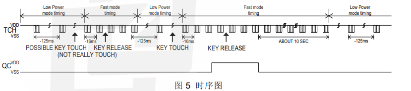 PT2043A 在低功耗模式下運行,可節(jié)省功耗,在此模式下偵測到按鍵觸摸后會切換至快速模式,直到按鍵觸摸釋放,并保持約 10 秒快速模式,然后返回低功耗模式。