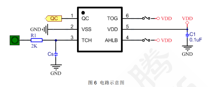 5) 可利用 Cs 電容調整靈敏度,Cs 電容值越小靈敏度越高,靈敏度調整必須根據(jù)實際應用的 PCB來做調整,Cs 電容值的范圍為 1~50pF。