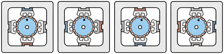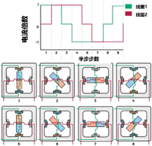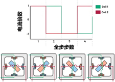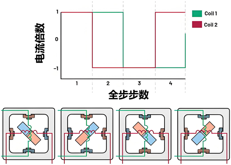 原理 :驅(qū)動器向兩個線圈通正或負(fù)電流,使兩相同時通電以實(shí)現(xiàn)最大扭矩。通過切換線圈電流方向,可使電機(jī)軸按固定步距角旋轉(zhuǎn),這種換向模式遵循特定序列。