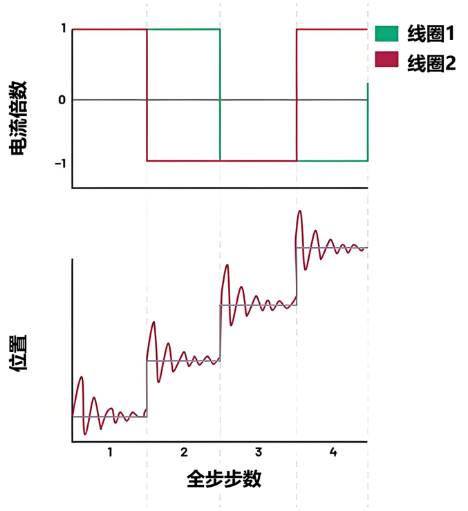 圖 5. 全步運(yùn)行時的過沖和振蕩。(圖片來源于ADI)如上圖,全步模式呈現(xiàn)出周期性的階梯狀變化。可以看到在每個全步切換時,轉(zhuǎn)子位置會出現(xiàn)明顯的過沖(overshoot,即位置超過了預(yù)期的穩(wěn)定位置)和振蕩(ringing,即位置在穩(wěn)定位置附近波動)現(xiàn)象。例如,在從第一步切換到第二步時,轉(zhuǎn)子位置先快速上升超過了第二步的穩(wěn)定位置,然后在該位置附近振蕩一段時間后才逐漸穩(wěn)定。