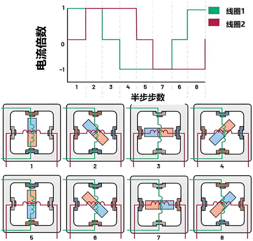 原理 :半步模式在全步模式基礎(chǔ)上,通過在兩相通電切換過程中增加一個額外電流狀態(tài),使每個磁極對的轉(zhuǎn)子位置數(shù)量翻倍,達(dá)到八個,從而將步長減半,實(shí)現(xiàn)位置分辨率的提升。電機(jī)驅(qū)動器通過交替進(jìn)行單相和雙相勵磁來實(shí)現(xiàn)這種半步行為。