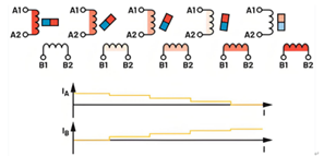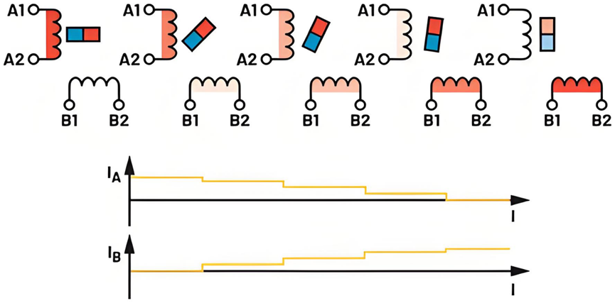 圖 7. 微步控制時通過每個線圈的電流。(圖片來源于ADI)如上圖,展示了微步控制過程中電機(jī)的不同狀態(tài),包括線圈 A1、A2 和 B1、B2 的通電情況以及轉(zhuǎn)子的相應(yīng)位置變化,直觀地呈現(xiàn)了微步控制下電機(jī)的工作過程。