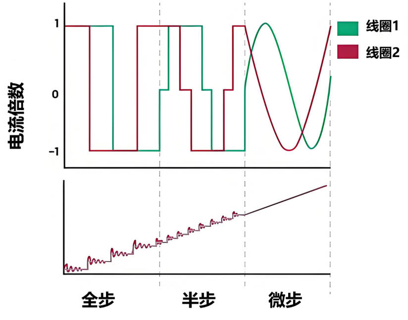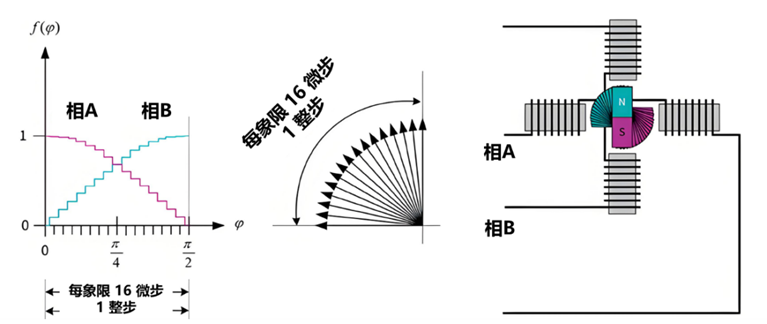 圖 8. 不同步模式下電流波形和位置過沖 / 振蕩的比較。(圖片來源于ADI)如上圖,綠色曲線(線圈 1)和紅色曲線(線圈 2)分別展示了在不同步模式下兩個線圈的電流變化情況??梢悦黠@看出,全步模式下電流變化是階梯狀的,半步模式下階梯更細(xì)密,而微步模式下電流變化趨近于正弦波,更加平滑。下方是位置過沖 / 振蕩圖,展示了在不同步模式下轉(zhuǎn)子位置的變化情況。全步模式下位置過沖和振蕩明顯,半步模式有所改善,微步模式下位置變化更加平穩(wěn),幾乎沒有明顯的過沖和振蕩,進(jìn)一步說明了微步控制在改善電機(jī)運(yùn)行性能方面的優(yōu)勢。2). 工作方式與技術(shù)實(shí)現(xiàn)微步控制實(shí)現(xiàn)了最佳的運(yùn)行行為。在這里,相不僅被接通和斷開,還被充入不同的電流值。兩個相由偏移 90° 的近似正弦波控制。一個全步被分成更小的單元。這些被稱為 “微步”。微步分辨率是一個全步被劃分成的中間位置的數(shù)量。