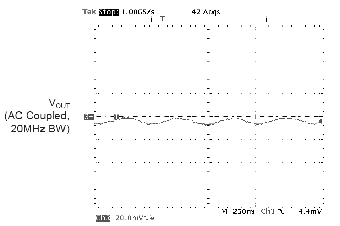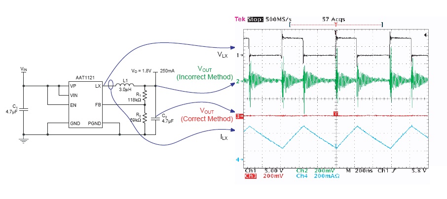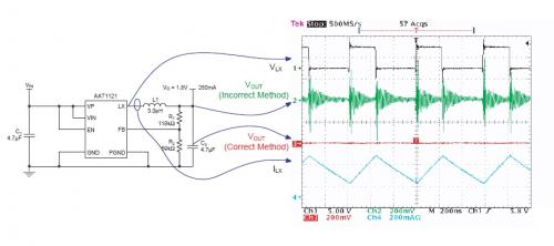 實(shí)測(cè)案例(Example) 下圖描述了采用兩個(gè)不同的測(cè)試方法得到的Vout波形。電源電路是一個(gè)BUCK轉(zhuǎn)換電路(AAT1121),工作在1.5MHz的開關(guān)頻率,輸出電壓為1.8V/250mA。示波器采用全帶寬測(cè)試??梢钥吹桨殡S著PWM開關(guān),在綠色的trace2有一個(gè)很高的噪音以及振鈴,但是trace3上卻沒有明顯的噪聲。通過對(duì)比可以看到,測(cè)試方法的選擇對(duì)結(jié)果的準(zhǔn)確性很關(guān)鍵。 下圖是采用20MHz帶寬限制測(cè)試到的電源的紋波以及噪聲。示波器20MHz的帶寬限制是為了防止無(wú)源探頭帶入的共模噪聲??梢钥吹紸AT1121BUCK轉(zhuǎn)換器的紋波噪聲為10mVp-p,幾乎看不到開關(guān)噪聲。這主要是歸功于BUCK控制器的低噪聲設(shè)計(jì),良好的PCB設(shè)計(jì),以及恰當(dāng)?shù)臏y(cè)試方法。 總結(jié) 下面總結(jié)一下正確的測(cè)量DC/DC開關(guān)電源紋波和噪音的方法。 1)限制示波器帶寬為20MHz(大多中低端示波器檔位限制在20MHz,高端產(chǎn)品還有200MHz帶寬限制的選擇),目的是避免數(shù)字電路的高頻噪聲影響紋波測(cè)量,盡量保證測(cè)量的準(zhǔn)確性。 2)設(shè)置耦合方式為交流耦合,方便測(cè)量(以更小檔位來仔細(xì)觀測(cè)紋波,不關(guān)心直流電平)。 3)保證探頭接地盡量短(測(cè)量紋波動(dòng)輒上百mV的主要原因就是接地線太長(zhǎng)),盡量使用探頭自帶的原裝測(cè)試短針。如果沒有測(cè)試短針,可以拆除探頭的接地線和外殼,露出探頭地殼,自制接地線纏繞在探頭地殼上,保證接地線長(zhǎng)度小于1cm。 |
