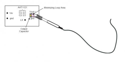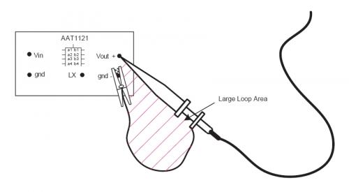 接下來描述了在錯(cuò)誤以及正確測(cè)量電源紋波噪聲的兩種方式。 下圖是一個(gè)錯(cuò)誤的測(cè)量方式,因?yàn)槭静ㄆ鞯牡鼐€會(huì)拾取輻射噪聲。示波器的地線和信號(hào)探頭形成的環(huán)路形成了一個(gè)天線。環(huán)路面積越大,在電源PWM切換時(shí),示波器接受到的開關(guān)噪聲就越大。 在測(cè)量中,如何減小拾取的輻射噪聲?最簡(jiǎn)單可靠的方法是采用一個(gè)接地環(huán)來測(cè)量電源紋波以及噪聲。為了進(jìn)一步的降低測(cè)試誤差,可以將示波器探頭和地線直接放在電源輸出電容得兩端。如下圖所示,采用這種方法,在信號(hào)探頭和地線之間的環(huán)路面積很小,所以測(cè)量中帶來誤差的噪聲幾乎可以忽略。