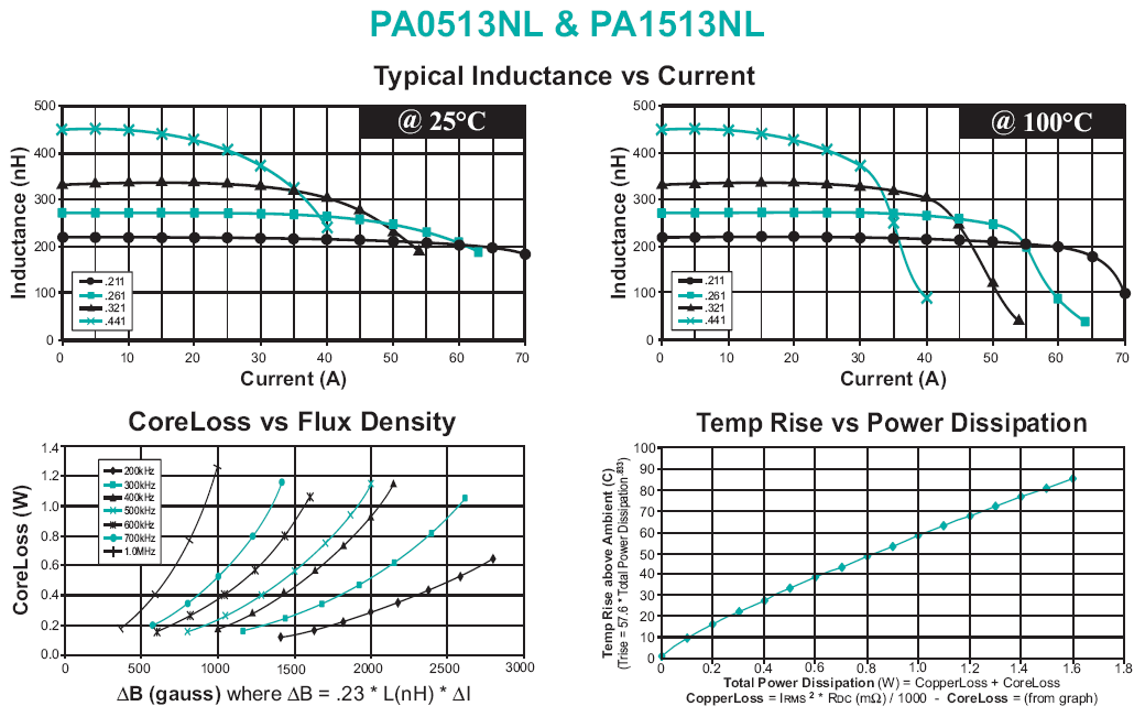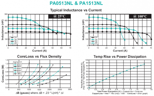 △B = .23* L(nH)* △I = 0.23 * 320(nH)* 30% * ILOAD = 662.4 由于開關電源工作在600KHz的頻率下面,查表可以得到鐵損大概在0.18W左右。 那么總的損耗如下: Total Power Dissipation(W)= CopperLoss + CoreLoss = 0.711W 通過查表,可以得到電感在正常工作的情況下,溫升大概是45攝氏度。 評估電感的損耗主要作用是,一是看電感的損耗是否會引起電感過熱的情況,導致電感值下降甚至損壞;第二個作用是用來調整電感的參數,提升整個電源轉換系統(tǒng)的效率。 3、關于CoreLoss 其實很多電感公司的datasheet上都沒有給出CoreLoss的計算方法以及曲線,如果這樣的話,計算鐵損就幾乎成為一個不可能事情了。對于這個情況,有兩個建議。 如果這個電感是用在很大電流的并且比較關鍵的設備中的話,那么電感請選有提供鐵損的供應商,比如Pulse,Wurth,JW Miller等; 如果是在電流比較小或者開關頻率比較低的場合,一般鐵損并不是關鍵因素。那么先評估銅損是否OK,留有一定的裕量,如果在后續(xù)的測試中發(fā)現電感過熱的話,想辦法降低電源的開關頻率,或者采用DCR小一點的電感。 |
