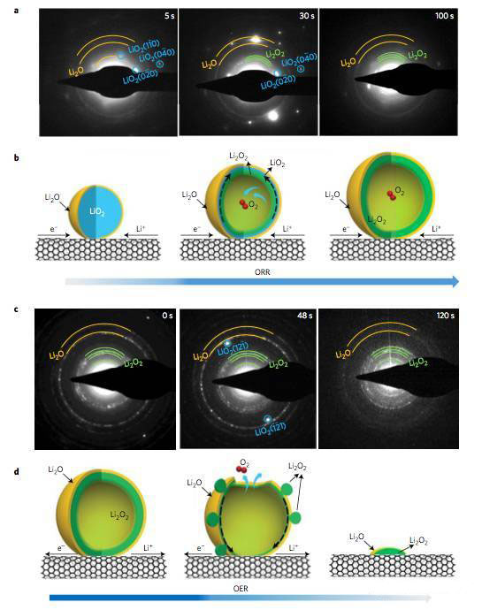 環(huán)境透射電子顯微鏡能夠在氧氣環(huán)境下進(jìn)行工作,從而使得在原子級別對鋰氧電池的反應(yīng)過程進(jìn)行直接的觀測成為可能。實(shí)驗(yàn)中Langli Luo利用載有納米RuO2催化劑的CNT作為正極,金屬Li作為負(fù)極,金屬Li表層的Li2O作為固體電解質(zhì),電池結(jié)構(gòu)如下圖所示。 反應(yīng)產(chǎn)物的形成過程如下圖所示,從圖上我們可以注意到,在反應(yīng)開始不久后,就在三相界面出現(xiàn)了一個中空的球,隨后這個球持續(xù)長大,從一開始直徑50nm到最后生長到了200nm,隨后該中空球結(jié)構(gòu)開始收縮和坍塌。目前還不清楚,為何反應(yīng)產(chǎn)物不形成固體顆粒或者是層狀結(jié)構(gòu)。為了對這其中的機(jī)理進(jìn)行深入的理解,Langli Luo采用了局部電子衍射技術(shù)(SAED)對充放電過程中材料的相變進(jìn)行了研究。