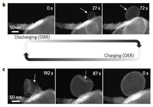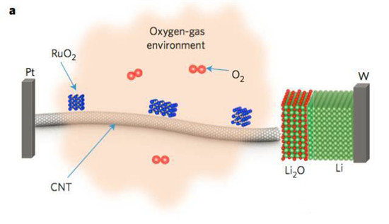 來自美國西北太平洋國家實(shí)驗(yàn)室的Langli Luo等人近日利用環(huán)境透射電子顯微鏡對全固態(tài)Li-O2電池的反應(yīng)機(jī)理進(jìn)行了研究,研究顯示在CNT表面首先形成LiO2化合物,隨后該產(chǎn)物發(fā)生歧化反應(yīng)生成Li2O2和O2,O2的釋放生成了一個外層由Li2O構(gòu)成,內(nèi)層由Li2O2構(gòu)成的中空球狀結(jié)構(gòu)。目前該型研究成果已經(jīng)發(fā)表在了最新的Natural Nanotechnology雜志上。