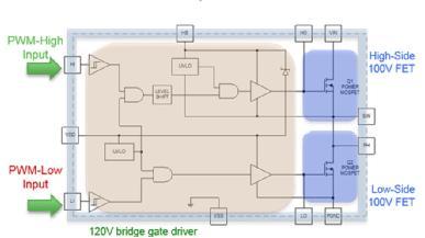FDMF8811集成了一對100V的功率MOSFET、120 V驅(qū)動器IC和一個自舉二極管到6.0 mm x 7.5 mm 的PQFN封裝。