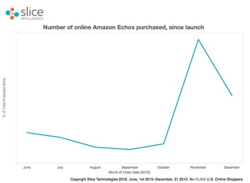Echo 2015年銷量數(shù)據(jù)走向 來源: Slice Intelligence 根據(jù)Slice Intelligence在線統(tǒng)計(jì)數(shù)據(jù),從2015年10月份開始,Echo的銷量迎來了一次井噴,并在11月達(dá)到了一波高潮。