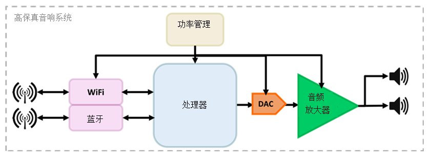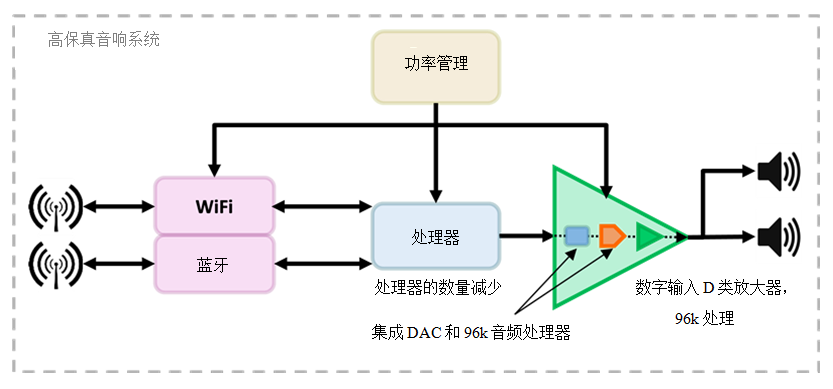 電源管理模塊為Wi-Fi?揚(yáng)聲器電路提供正確的功率電平。假設(shè)應(yīng)用由系統(tǒng)供電(而非電池供電),并且取決于輸出功率,電源不僅需要提供滿足系統(tǒng)功率要求所需的電壓和電流;它還需要提供干凈穩(wěn)定的電源軌,以防止任何電源噪聲進(jìn)入音頻系統(tǒng)并降低音頻質(zhì)量。 連接模塊通過計(jì)算機(jī)、智能手機(jī)、平板電腦或支持無線功能的產(chǎn)品使用Wi-Fi或Bluetooth?向系統(tǒng)提供無線通信。標(biāo)準(zhǔn)藍(lán)牙模塊今天為便攜式音頻系統(tǒng)提供一體式解決方案,因?yàn)樗鼈儽旧碇С譄o線和有線音頻。但是由于無損高分辨率音頻流需要更高的帶寬,它們的有限帶寬構(gòu)成了潛在的瓶頸。新的藍(lán)牙音頻編碼技術(shù)承諾增加帶寬,以支持高清音頻。 另一方面,Wi-Fi包括更大的網(wǎng)絡(luò)容量、強(qiáng)大的信令和更廣泛的無線射頻范圍。其增加的帶寬容量和系統(tǒng)吞吐量使其更適合于高清音頻應(yīng)用。 處理器執(zhí)行各種音頻處理功能,如解碼和信號(hào)均衡,同時(shí)也處理Wi-Fi和/或藍(lán)牙通信軟件堆棧。過去,CD品質(zhì)的采樣頻率可能已足夠。但是今天的高保真音頻系統(tǒng)對(duì)信號(hào)鏈中的處理器提出了其它要求,因?yàn)楦弑U嬉糍|(zhì)要求在24位音樂信號(hào)流中提供48kHz至192kHz范圍內(nèi)的采樣率。 音頻模塊包含驅(qū)動(dòng)系統(tǒng)中揚(yáng)聲器所需的所有電子設(shè)備。因?yàn)閬碜赃B接模塊和處理器的信號(hào)具有低電壓和低電流能力,因此音頻放大器為信號(hào)提供必要的更高電壓和電流能力來驅(qū)動(dòng)揚(yáng)聲器系統(tǒng)中的驅(qū)動(dòng)器。該模塊可以包括用于將來自處理器的數(shù)字音頻信號(hào)轉(zhuǎn)換為模擬音頻信號(hào)的音頻數(shù)模轉(zhuǎn)換器(DAC),并且在數(shù)字域中提供其它音頻處理,以進(jìn)一步豐富高端系統(tǒng)中的客戶體驗(yàn)。音頻模塊的另一個(gè)關(guān)鍵組件是音頻放大器。 音頻放大器:AB類與D類 為您的高清音頻系統(tǒng)選擇最佳音頻放大器時(shí),您有兩種選擇:AB類或D類。AB類音頻放大器是線性放大器,無需許多外部電子元件。但是它們的效率極低,并且需要以散熱片和風(fēng)扇的形式進(jìn)行大量無源或甚至是有源的熱管理。 另一方面,D類音頻放大器是高效的開關(guān)放大器,需要很少的熱管理,但它們需要輸出電感器。 多年來,高清音頻中的放大器是AB類放大器。音頻D類放大器被認(rèn)為不符合標(biāo)準(zhǔn),因?yàn)樗鼈儾环螲D音頻的所有要求;如今不復(fù)存在。TI的最新一代D類放大器通過與數(shù)字引擎建立共生關(guān)系,同時(shí)有效地將增強(qiáng)的音頻質(zhì)量傳輸?shù)綋P(yáng)聲器,提高了高清音頻系統(tǒng)的整體性能和效率。 優(yōu)化高清音頻設(shè)計(jì) 具有集成DAC和處理功能的高性能高清音頻放大器,如TI新的TAS5782M,可幫助音頻設(shè)計(jì)師大大簡(jiǎn)化設(shè)計(jì),降低成本并縮短設(shè)計(jì)周期。集成DAC通過提供將音頻放大器直接連接到處理器的方式來幫助降低系統(tǒng)復(fù)雜性,確保最大化信號(hào)完整性,并減少組件數(shù)量。 集成音頻處理可通過將所有音頻處理卸載到放大器本身中,大大有助于降低主應(yīng)用處理器的成本和計(jì)算需求。您可通過降低主處理器的成本和尺寸來進(jìn)一步降低成本和尺寸。圖2是優(yōu)化的框圖。 圖2:優(yōu)化的高清音頻系統(tǒng) |