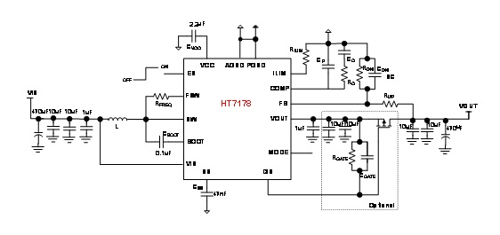 ①.HT7178的輸入電壓范圍是2.7V到15V, 輸出電壓范圍是4.5V到20V。該芯片集成了兩個低導(dǎo)通電阻的功率MOSFET:一個11m?開關(guān)FET和一個13m?整流器FET,使用具有集成斜坡補償功能的固定頻率峰值電流模式控制。HT7178 PFM,PWM兩種模式可選,匹配不同的應(yīng)用場合,提高效率。