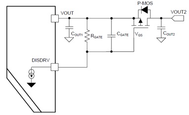 從上圖我們可以看到,所需要的外部器件很少。該芯片還提供一個單獨的 pin 腳 DIS來驅(qū)動負載輸出端的外部 FET(P-FET),在設(shè)備關(guān)斷或者輸出短路時它能完全斷開輸入與輸出的連接。啟動時,通過內(nèi)部電流源來控制外部 P-FET 開關(guān)。在關(guān)斷或者輸出短路時,將輸出與輸入側(cè)隔離,如下圖: