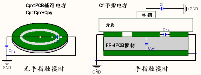 無手指觸摸和有手指觸摸時電容構成如下圖。當沒有手指接觸時, 只有基準電容Cp ; 當有手指接觸時,“按鍵”通過手指就形成了電容Cf 。由于兩個電容是并聯(lián)的, 所以手指接觸“按鍵”前后, 總電容的變化率為: C% = ((Cp+Cf)-Cp)/Cp = Cf/Cp 圖2