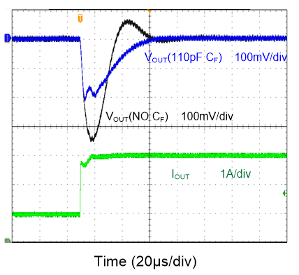 進(jìn)行相同的負(fù)載瞬變響應(yīng)測(cè)試,在增加前饋電容后,輸出電壓的最大偏移量從340mV降低為200mV,發(fā)生了明顯改善。