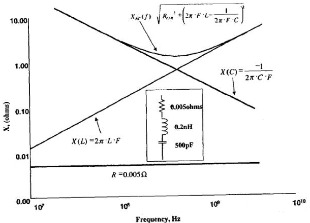 用等效交流阻抗來評估一個去耦電容的優(yōu)劣,等效交流阻抗用電阻、電感和電容阻抗的均方根值來近似:ohms