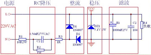 阻容降壓電路由降壓模塊、整流模塊、穩(wěn)壓模塊和濾波模塊組成。