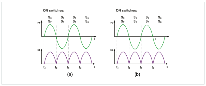 區(qū)塊2的功能是提供隔離以及固定比率電壓升降。通過在變壓器上增加一個小電容,這個小電容的自然諧振頻率和變壓器的漏感可提供零電流開關(guān)[k – l]。利用一次側(cè)電流的固有諧振頻率,MOSFET可在其諧振部分的過零點開關(guān)。當(dāng)諧振電流達(dá)到零時,S5、S6、S7和S8就會始終開啟和關(guān)閉。當(dāng)S5和S7開啟(t1至t2期間)時,一次側(cè)諧振電流IP以正弦波的形式流動,直至其達(dá)到零為止。然后,S6和S8會開啟,并且一次側(cè)諧振電流IP仍保持正弦波的形狀,以相反的方向流動,如t2至t3期間所示。如圖3所示,相同的開關(guān)序列可在兩個方向的運行,因而該電路自然是雙向的。