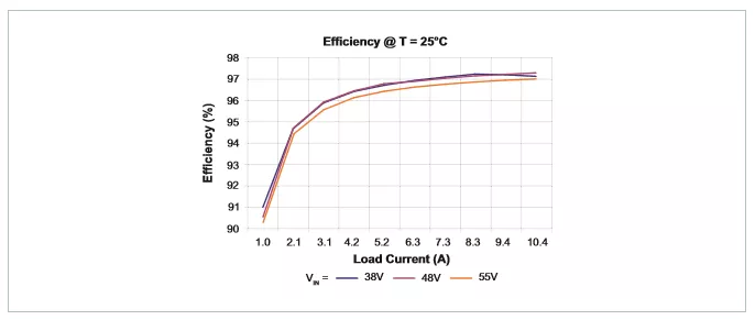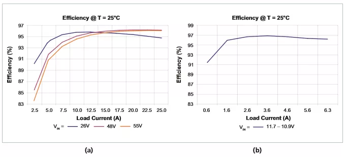 當(dāng)VIN=48V,功率為300W,區(qū)塊2的模塊轉(zhuǎn)換比率為4:1時,負(fù)載超過50%后,測試的效率超過96%,峰值效率為96.2%。當(dāng)負(fù)載低于50%時,效率下降,但負(fù)載為10%時仍能實現(xiàn)85.5%的效率。所有這些測試都是在室溫條件下進(jìn)行的。圖5(a)顯示了在不同輸入電壓和負(fù)載條件下的效率矩陣測試??蓪⑤斎腚妷涸O(shè)計為26-55V,這樣6.5-13.75V的電池電壓就能反向支持母線。這一寬范圍可實現(xiàn)更多的電池配置,更為重要的是,有助于延續(xù)電池為母線提供支持的時間。