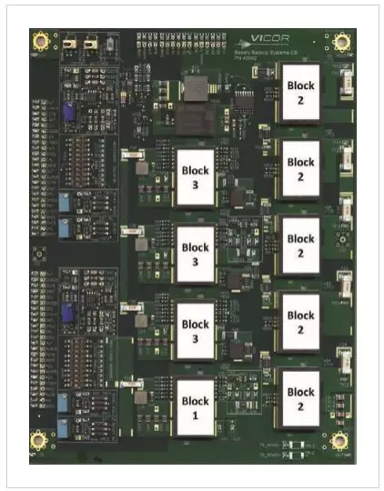 針對該應(yīng)用構(gòu)建了這一雙向DC-DC轉(zhuǎn)換器的7×9英PCB樣機,如圖7所示,三個區(qū)塊3模塊(每個模塊500W)并聯(lián),五個區(qū)塊2模塊(每個模塊300W)并聯(lián)。