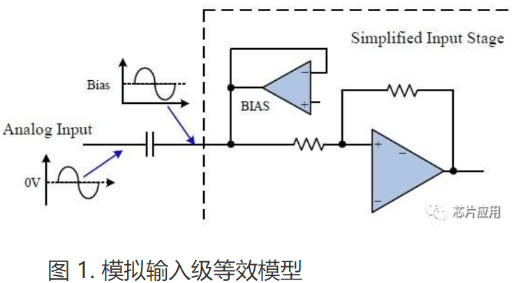功放是單電源供電的模擬輸入Class D 功放,這類功放的模擬輸入必須工作在直流偏置(DC BIAS)點(diǎn)上才可以正常傳輸交流音頻信號(hào),簡(jiǎn)化的輸入級(jí)模型如圖1 所示。功放 的直流偏置電壓設(shè)定在3V。