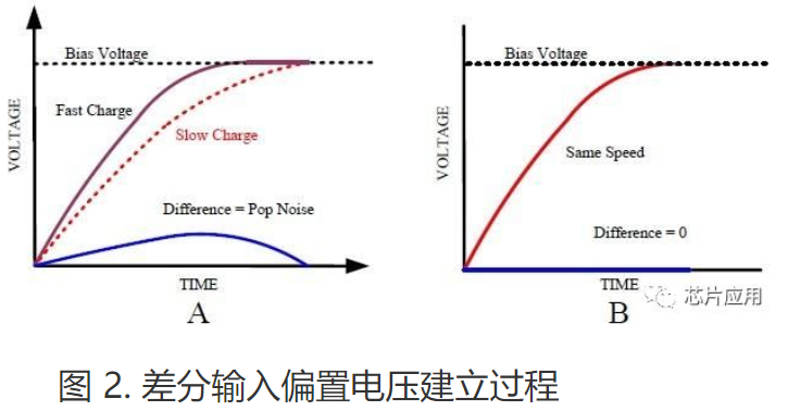 功放差分輸入INN 和INP 的輸入偏置電壓建立的過(guò)程如圖2所示,若差分輸入N 和P 端的輸入偏置電壓建立速度不一樣則兩者之差會(huì)形成差分信號(hào)輸入功放并被放大輸出,形成啟動(dòng)時(shí)的POP 聲。差分輸入端偏置電壓建立過(guò)程的不平衡通常是因?yàn)檩斎爰?jí)INN 和INP外部的阻抗不匹配所致。這種情況最容易出現(xiàn)在差分輸入用作單端輸入狀態(tài)。