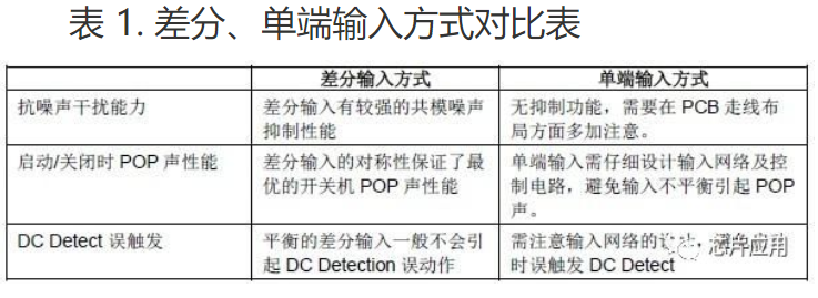 功放器件的模擬輸入是標(biāo)準(zhǔn)的差分輸入接口。在系統(tǒng)設(shè)計(jì)中,推薦使用差分輸入方式來(lái)接駁主芯片的音頻輸出。使用差分輸入方式可以不僅POP 聲的控制相對(duì)簡(jiǎn)單、信號(hào)抗干擾能力強(qiáng),而且不會(huì)引起DC Detection 功能的誤動(dòng)作。差分輸入方式和單端輸入方式的對(duì)比如下表所示: