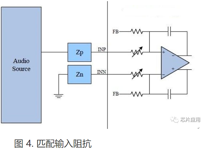 若使用單端輸入的方式連接功放 ,則必須注意輸入阻抗網(wǎng)絡(luò)的匹配問題。如圖5 所示,功放的INN 輸入端外部阻抗為Zn,通常Zn 為耦合電容。主芯片輸出阻抗一般很小,可認(rèn)為輸出阻抗為零,則INP 輸入端外部阻抗約為Zp。功放啟動(dòng)時(shí)內(nèi)部的偏置電壓會(huì)逐步建立,其過(guò)程即為向Zn 和Zp 阻抗網(wǎng)絡(luò)充電的過(guò)程。若Zn 和Zp 阻抗相差太大,INN 和INP 之間就會(huì)形成較大的差分信號(hào),該差分信號(hào)被功放放大之后則形成POP 聲。